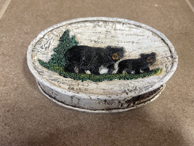Perfect for a cabin bath, this polyresin soap dish features the look of birch bark with embossed black bears and evergreens. 5 1/3″W x 3 3/4″D x 1″H